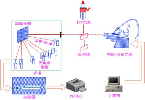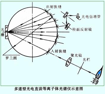 ICP炬管發射的輻射經入射狹縫射到凹面光柵上,經色散后,不同波長的光分別聚焦在預先設定的,排在羅蘭圓上不同的得出射狹縫上,然后由反射鏡反射至各自的PMT上。